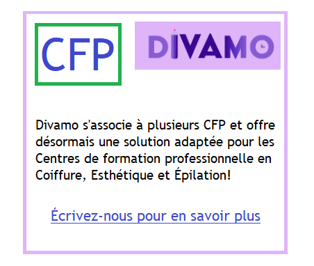 Divamo offre la possibilité de greffer un module de RDV en ligne directement à votre site web ou à votre page Facebook. La demande alimente directement vos instances de Divamo et elle ne prend que quelques secondes à remplir par le client. Vous augmenterez d'en moyenne 20% à 30% vos RDV et vous serez moins interrompu(e) par le téléphone. Chaque client reçoit une confirmation du RDV après son inscription. Ce module est en option