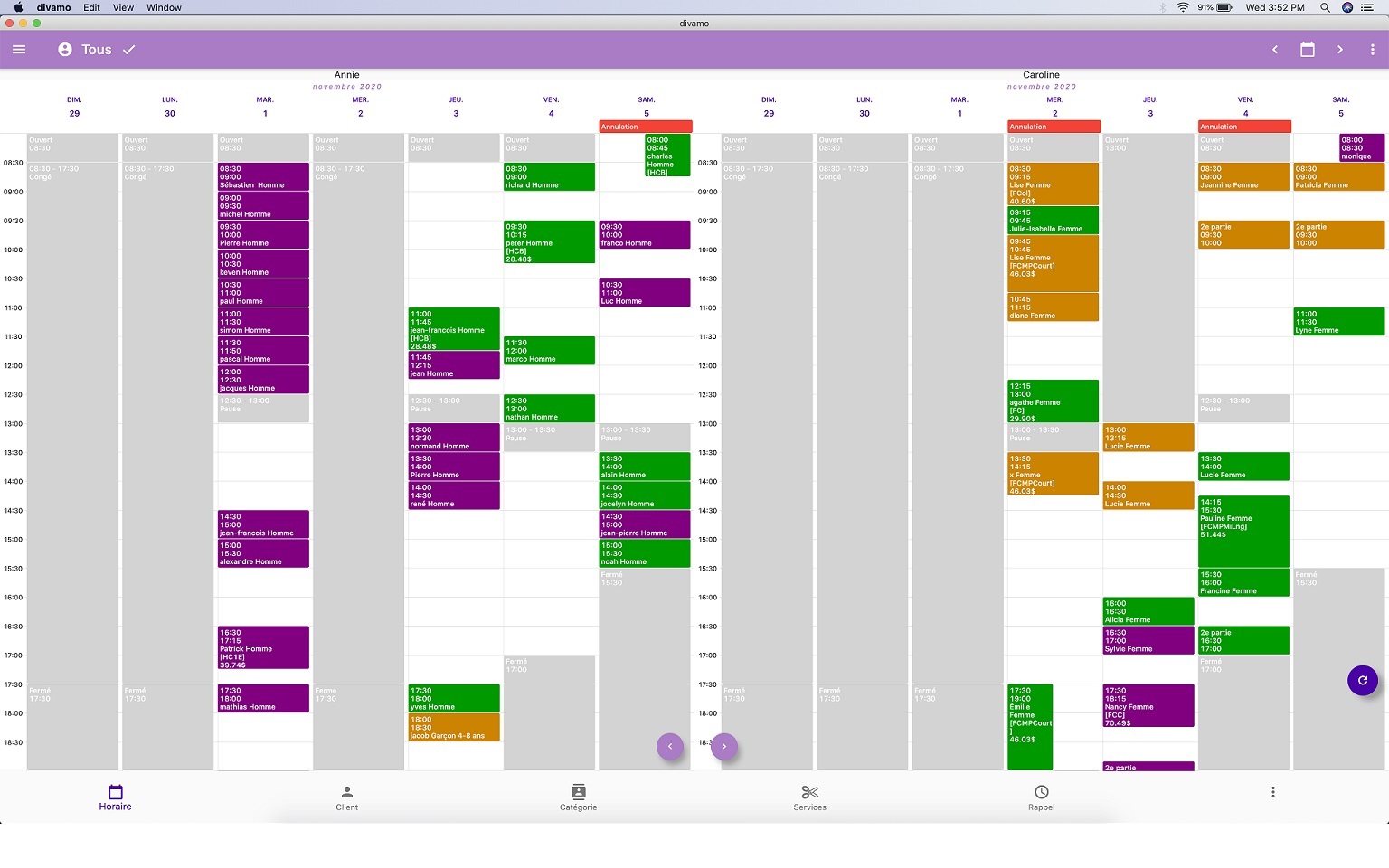 -Code de couleur pour le statut de chaque RDV (identique à Divamo Bureau)