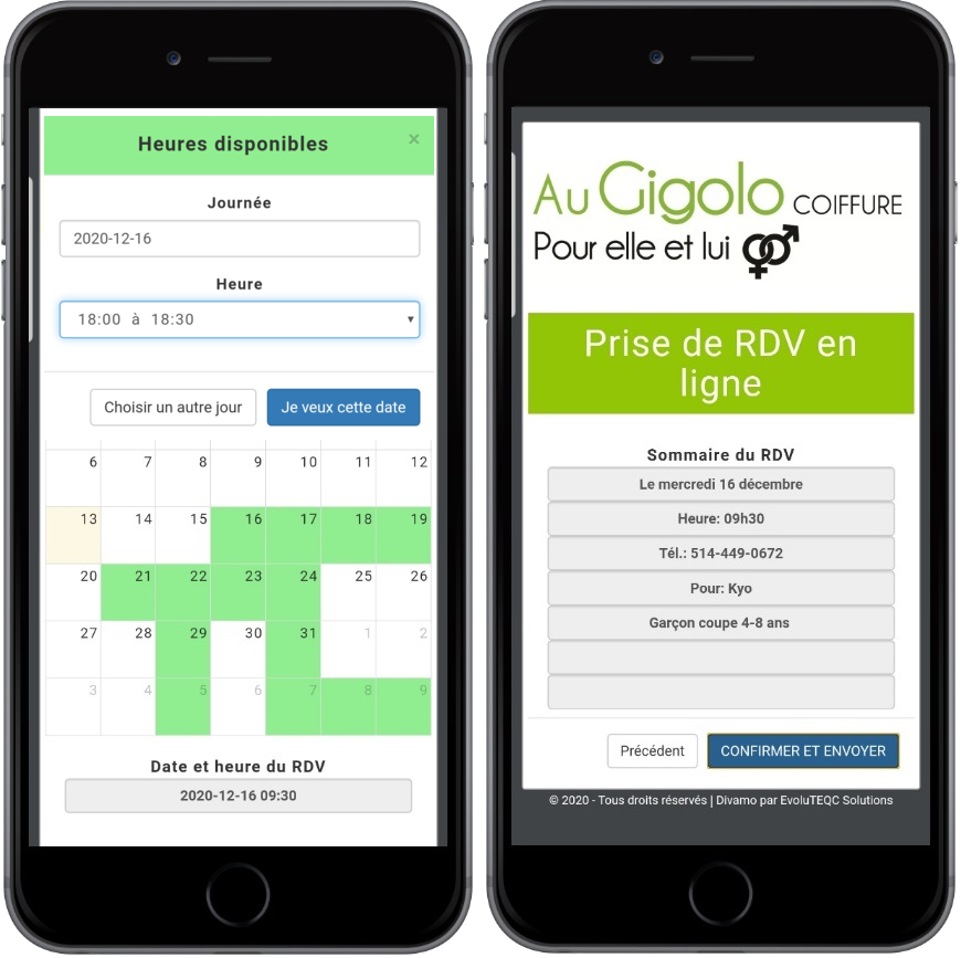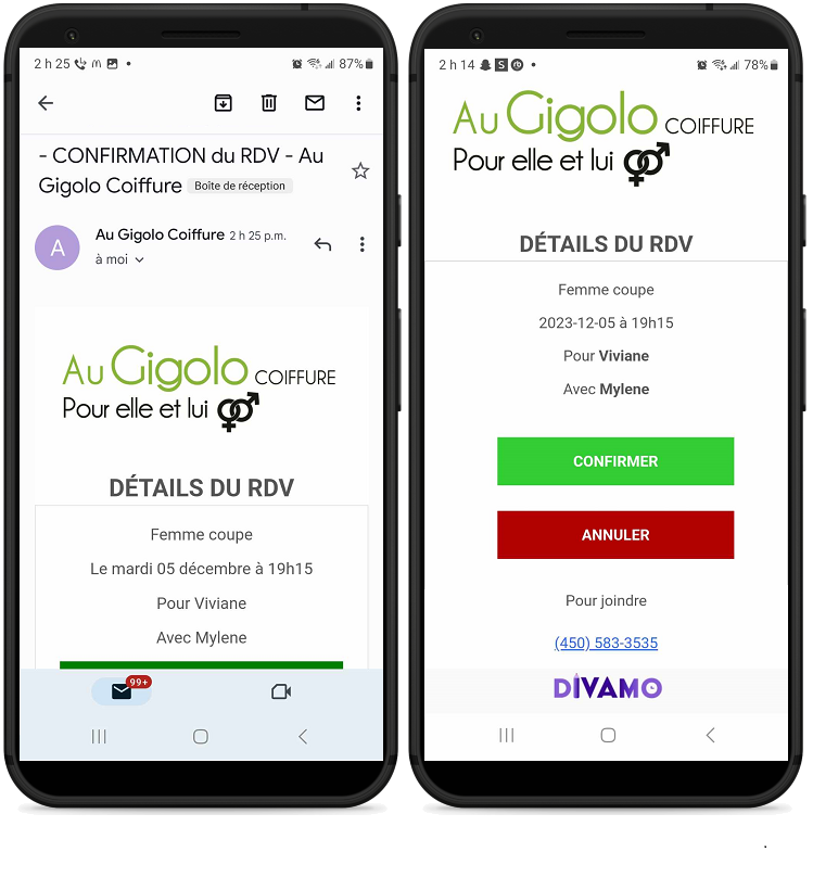 Nous savons tous que contacter les clients la veille de leur RDV évite les "no shows" (client qui ne se pointe pas). Puisque pratiquement tout le monde a un cellulaire de nos jours, Divamo peut s'acquitter de cette tâche en envoyant un rappel par SMS ou courriel la veille du RDV. Le client a le choix de confirmer ou d'annuler son RDV. Dès que la réponse du client est envoyée, le statut du RDV dans Divamo se mettra à jour. Tout se fait automatiquement.